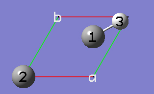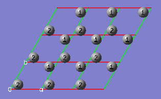 2-18 In the View tab of the PBC dialog, click on the Combine button in the Cell Replication section. This will cause the reference unit cell and the replicate unit cells shown on screen to be combined into a larger "supercell" which is nine times the primitive unit cell. Note the atom number changes. Note also that the number of cells being viewed is automatically reduced to one to avoid potential confusion.
