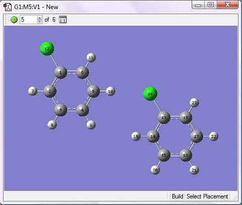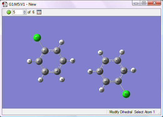 1. Create a new View window and place a benzene ring in it. Change one of the hydrogen atoms to Chlorine. Repeat this process to create a second chlorobenzene ring.