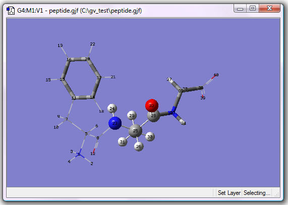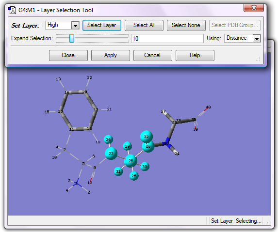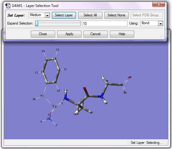 3. Assign the following atoms to the Medium layer: all atoms in Ala, carbons in Ring in Phe and atoms up to the double bond in Gly. Use any selection method you want; it will usually take two or more operations to assign all these atoms. For example, you can select the central carbon atom in Ala and drag the Expand Selection slider to add more atoms. Adding too few atoms is usually easier than adding too many. Click Apply.