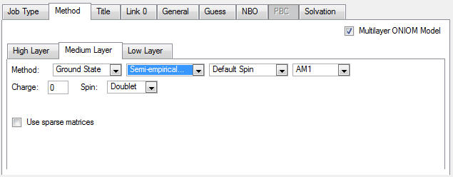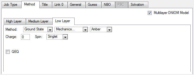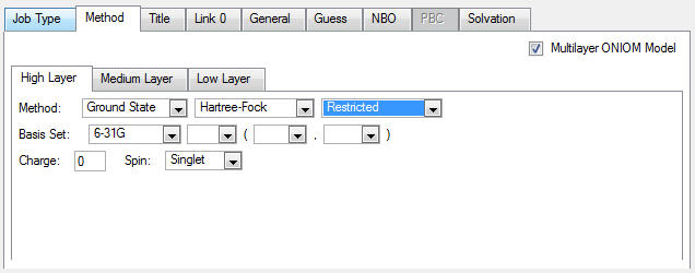 2. On the Method tab, check Multilayer ONIOM Model. Three tabs appear (High, Medium, and Low) in the Method section, which you can use to select the methods for treating each layer of atoms.