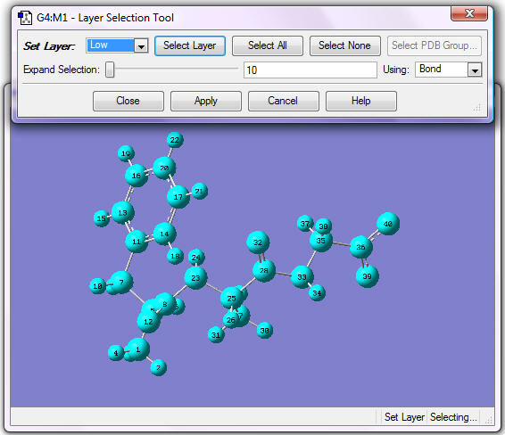 2. Assign all atoms to the Low Layer. Choose Select Layer from the Edit menu, and then click Select All. Verify that current layer is set to Low. The display will look similar to the following figure.